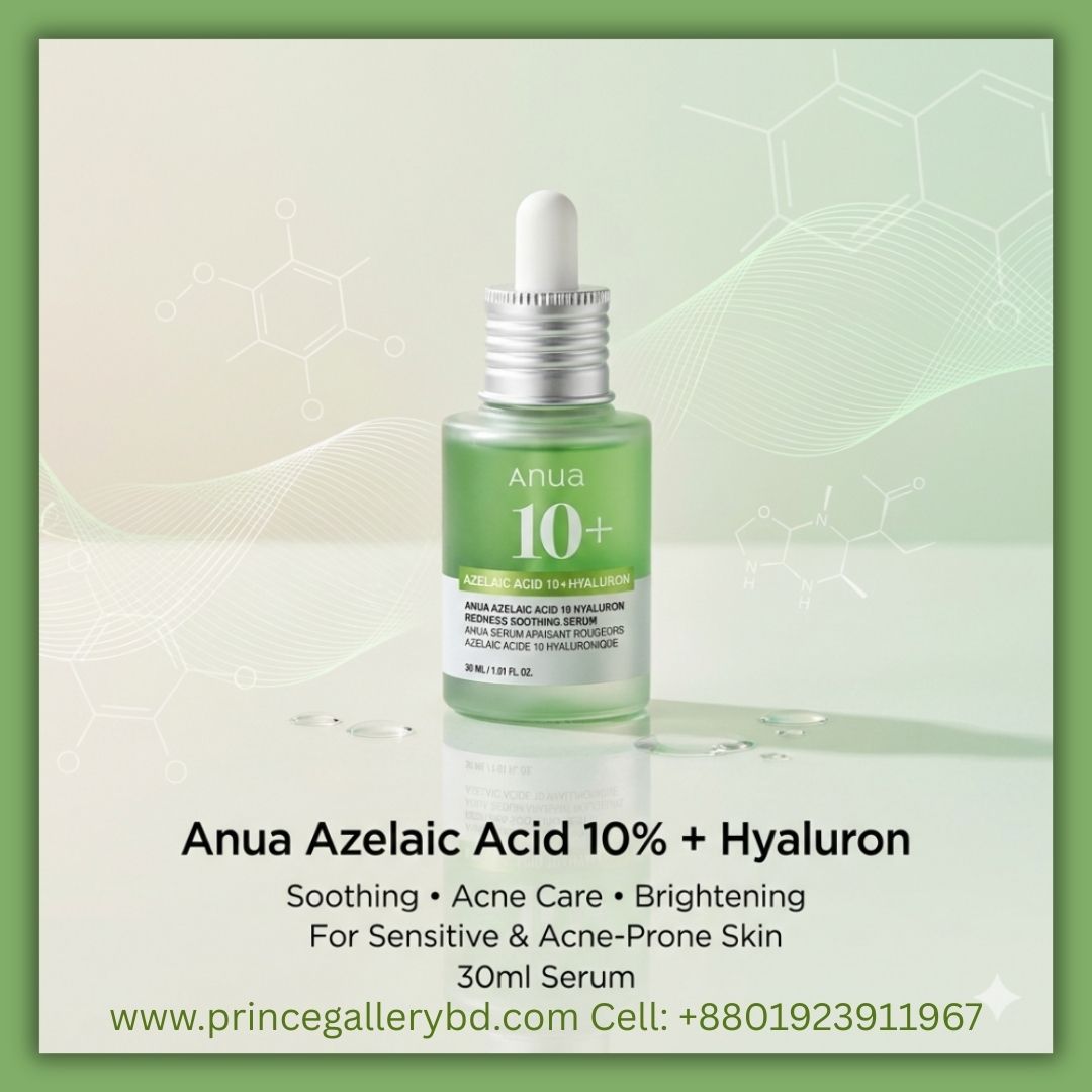 Anua Azelaic Acid 10% + Hyaluron Serum 30ml এর বর্তমান price in Bangladesh product batch ও import cost অনুযায়ী পরিবর্তিত হতে পারে। Prince Gallery BD সবসময় চেষ্টা করে best possible price-এ 100% original Anua serum সরবরাহ করতে।